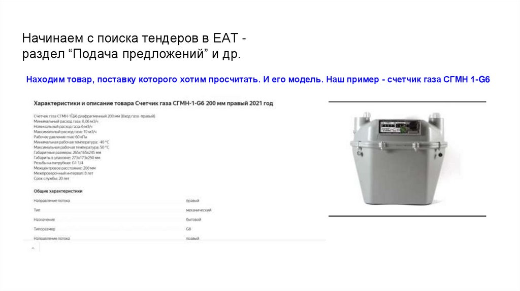 Начинаем с поиска тендеров в ЕАТ раздел “Подача предложений” и др.Находим товар, поставку которого хотим просчитать. И его модель. Наш пример - счетчик газа СГМН 1-G6
