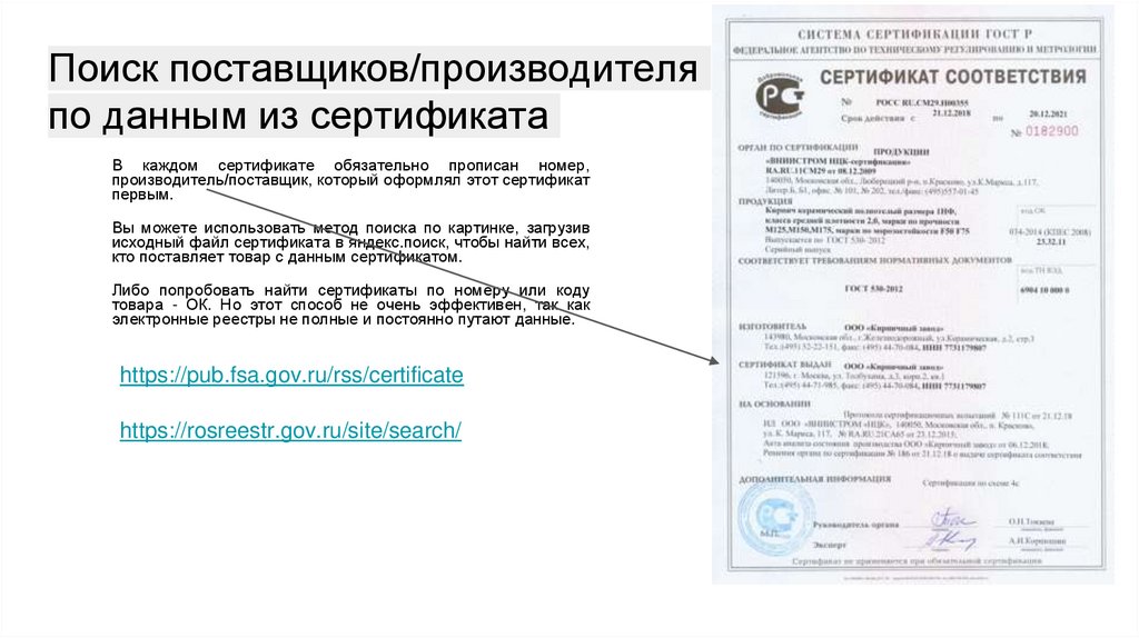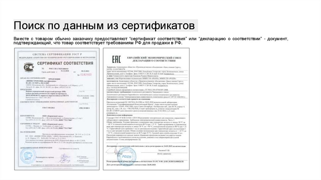 Поиск по данным из сертификатовВместе с товаром обычно заказчику предоставляют “сертификат соответствия” или “декларацию о соответствии” - документ,