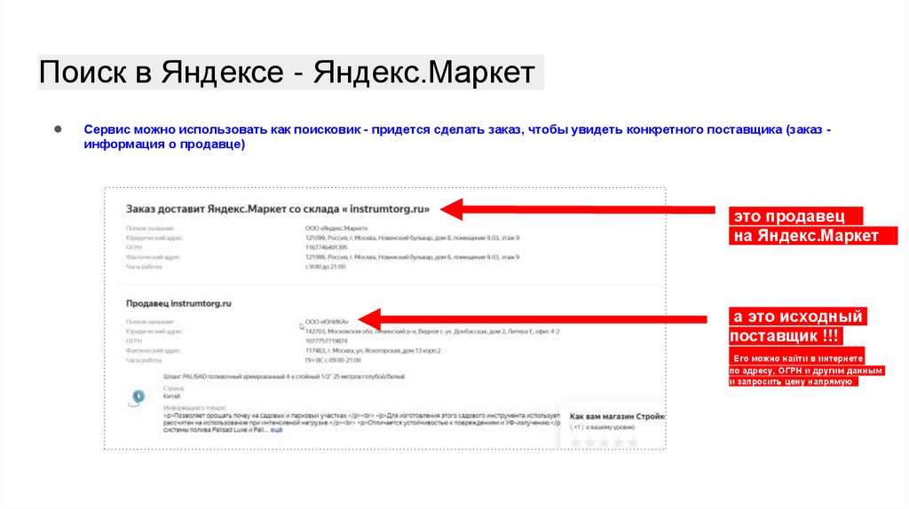 Поиск в Яндексе - Яндекс.МаркетСервис можно использовать как поисковик - придется сделать заказ, чтобы увидеть конкретного поставщика (заказ информация о продавце)