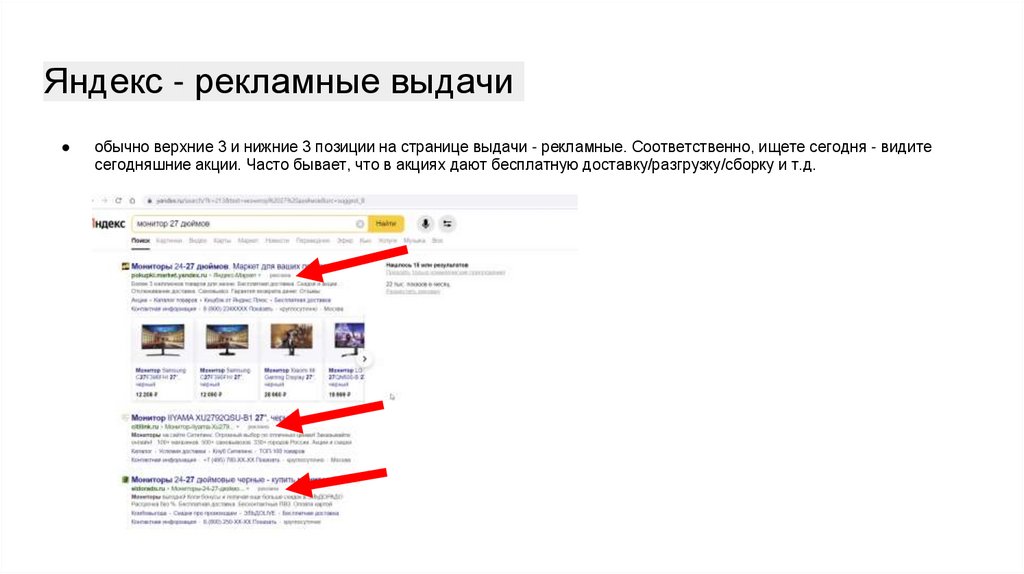 Яндекс - рекламные выдачиобычно верхние 3 и нижние 3 позиции на странице выдачи - рекламные. Соответственно, ищете сегодня - видите