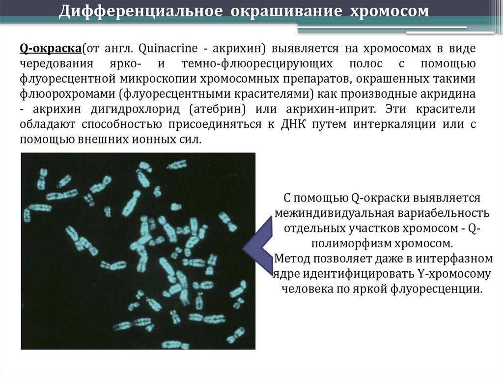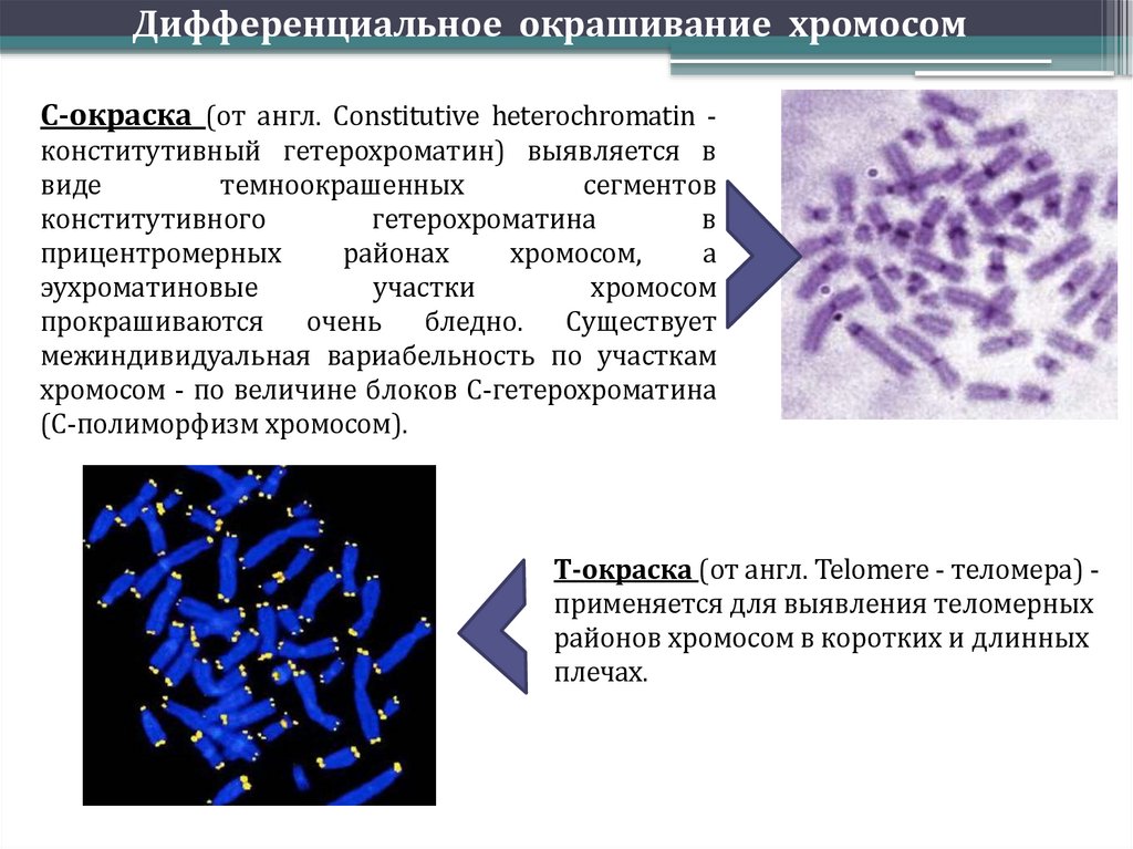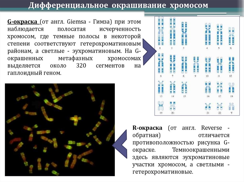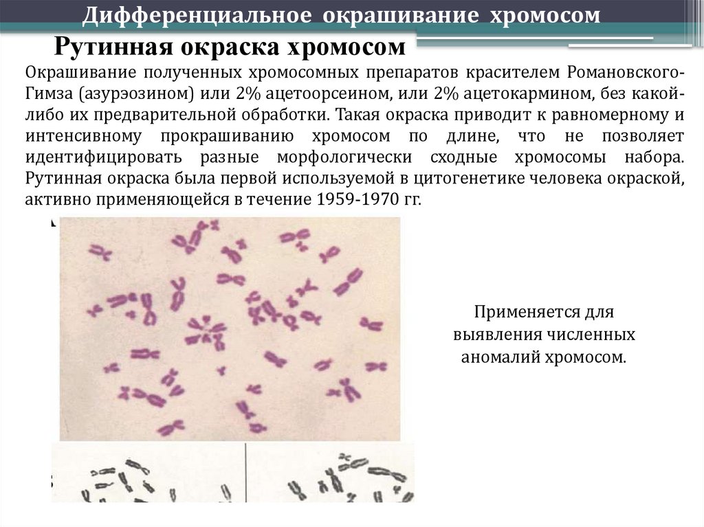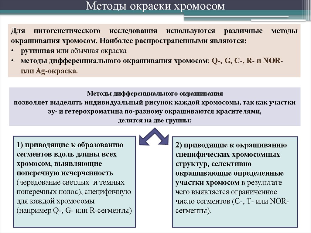 методы окраски хромосом (рутинная окраска хромосом, Q-окраска, Gокраска, R-окраска, С-окраска, Т – окраска, избирательная окраска,