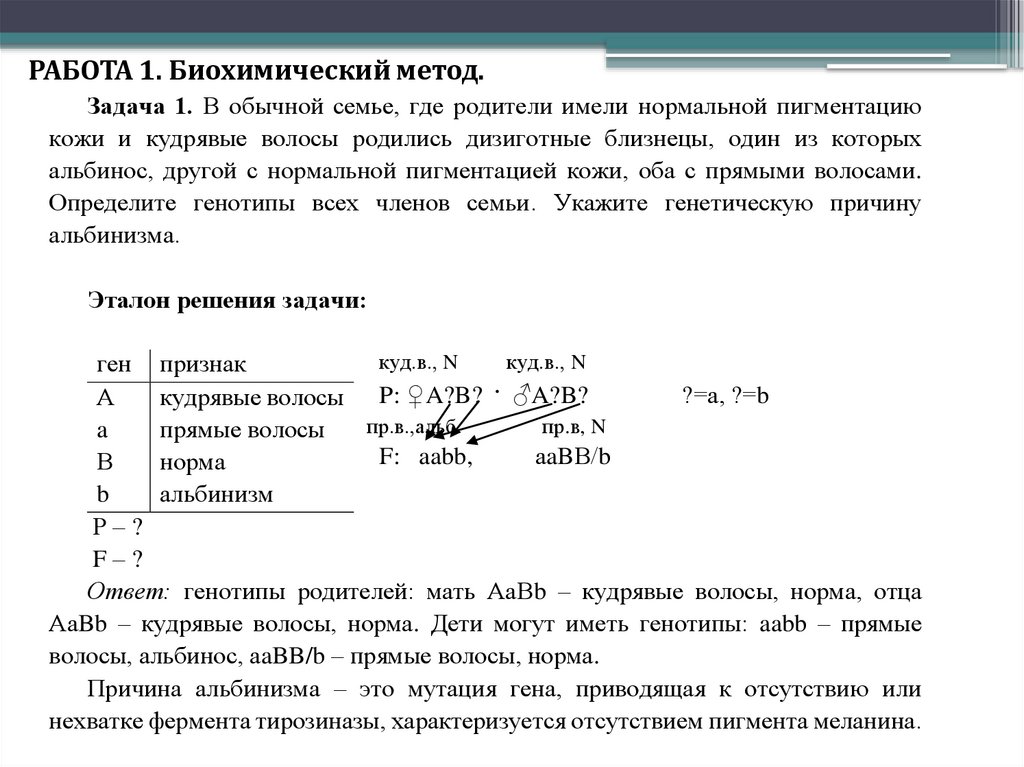 РАБОТА 1. Биохимический метод.Задача 1. В обычной семье, где родители имели нормальной пигментацию
