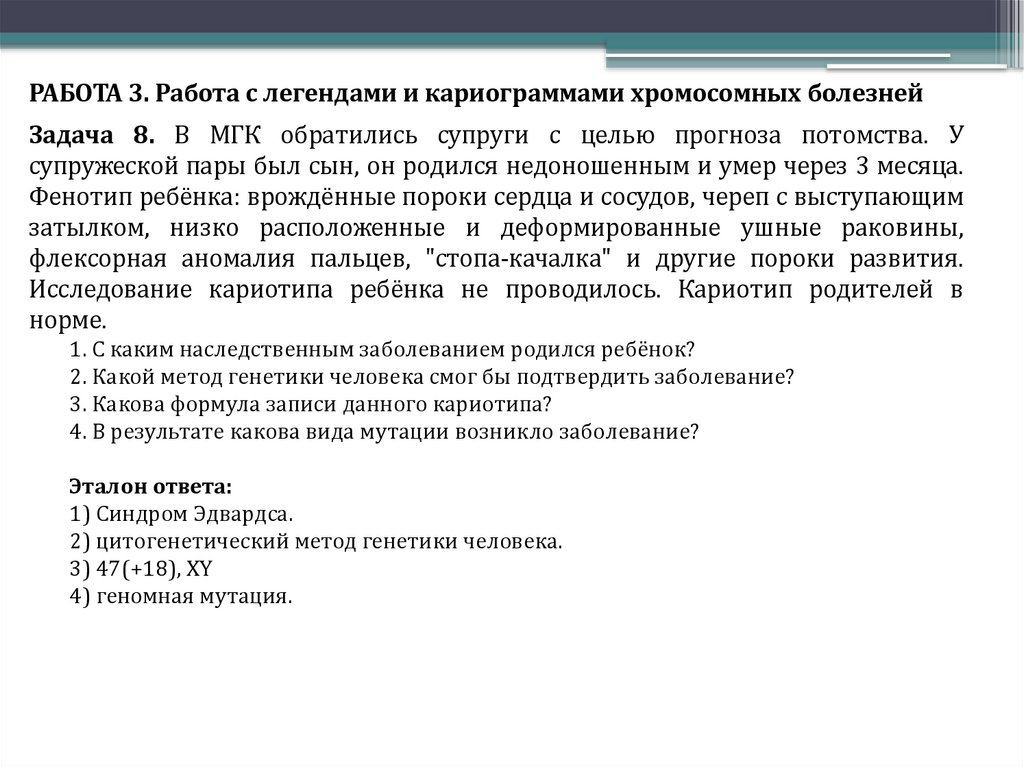 РАБОТА 3. Работа с легендами и кариограммами хромосомных болезнейЗадача 8. В МГК обратились супруги с целью прогноза потомства. У