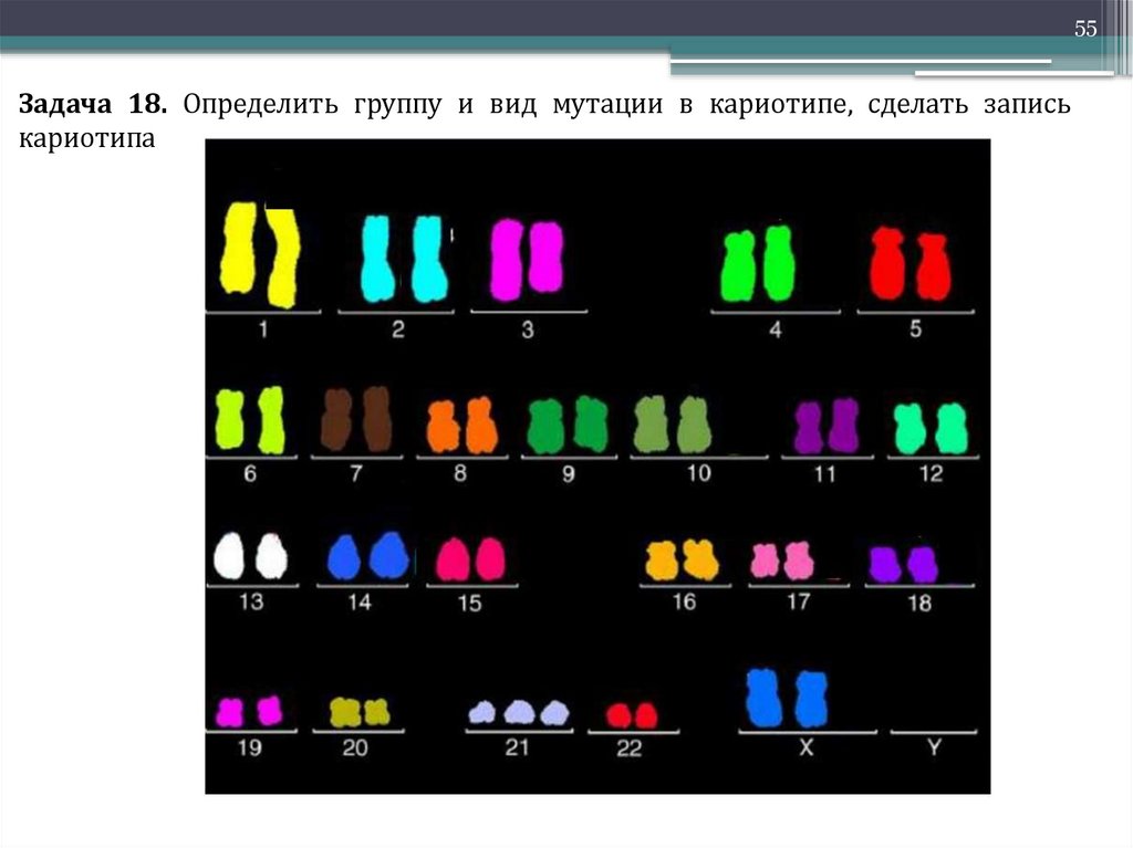 55Задача 18. Определить группу и вид мутации в кариотипе, сделать запись
