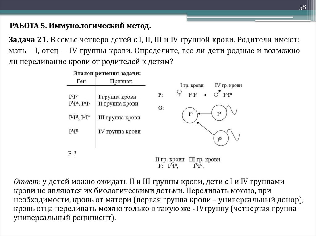 Задача 21. В семье четверо детей с I, II, III и IV группой крови. Родители имеют: