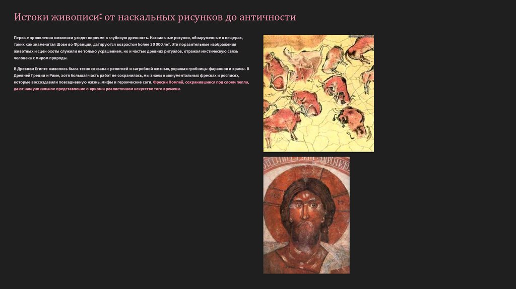 Истоки живописи: от наскальных рисунков до античностиПервые проявления живописи уходят корнями в глубокую древность. Наскальные рисунки, обнаруженные в пещерах,