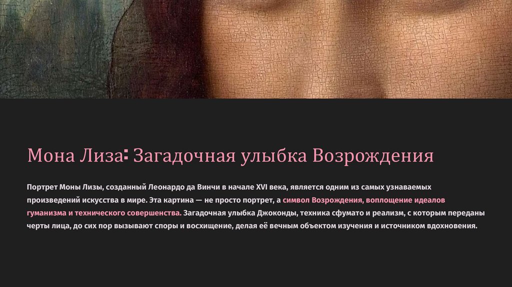 гуманизма и технического совершенства. Загадочная улыбка Джоконды, техника сфумато и реализм, с которым переданы