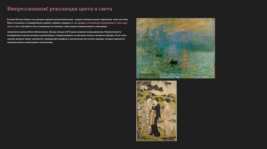 Импрессионизм: революция цвета и светаВ конце XIX века Париж стал центром художественной революции – родился импрессионизм. Художники, такие как Клод