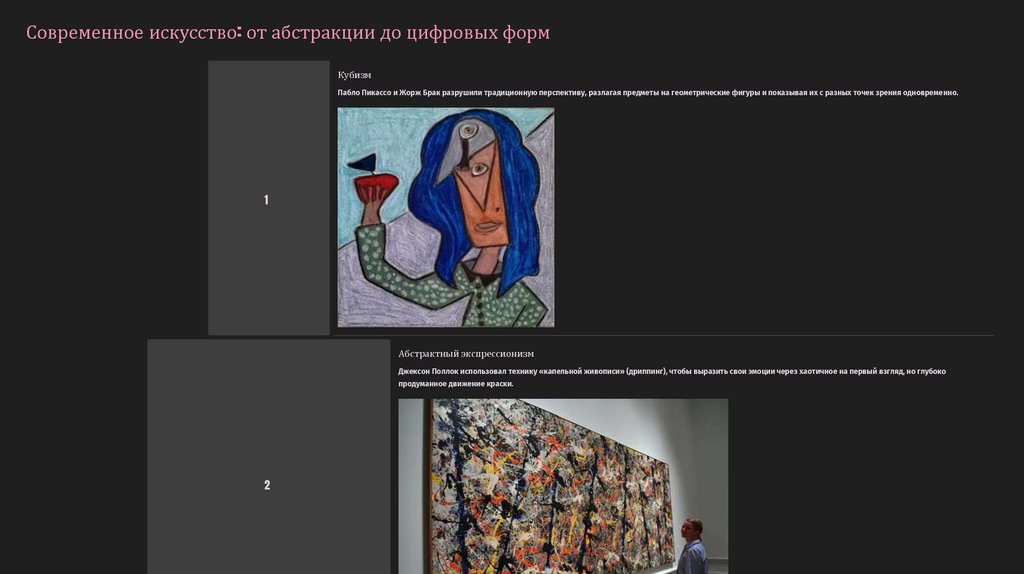 Пабло Пикассо и Жорж Брак разрушили традиционную перспективу, разлагая предметы на геометрические фигуры и показывая их с разных точек зрения одновременно.