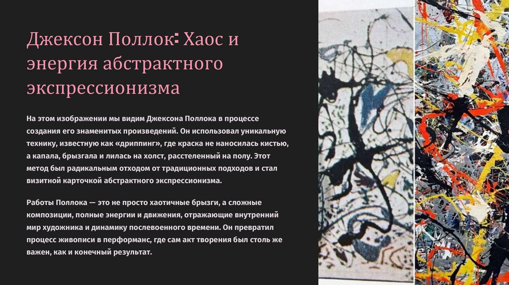 Джексон Поллок использовал технику «капельной живописи» (дриппинг), чтобы выразить свои эмоции через хаотичное на первый взгляд, но глубоко