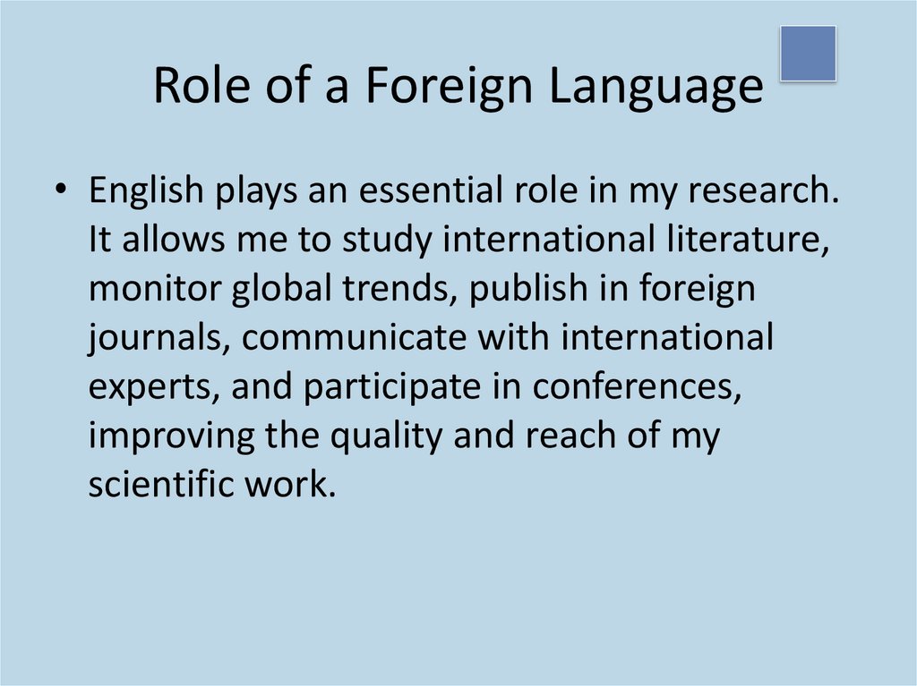 Role of a Foreign Language• English plays an essential role in my research.
