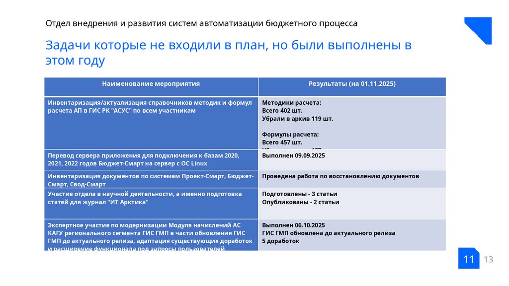 Отдел внедрения и развития систем автоматизации бюджетного процессаЗадачи которые не входили в план, но были выполнены в