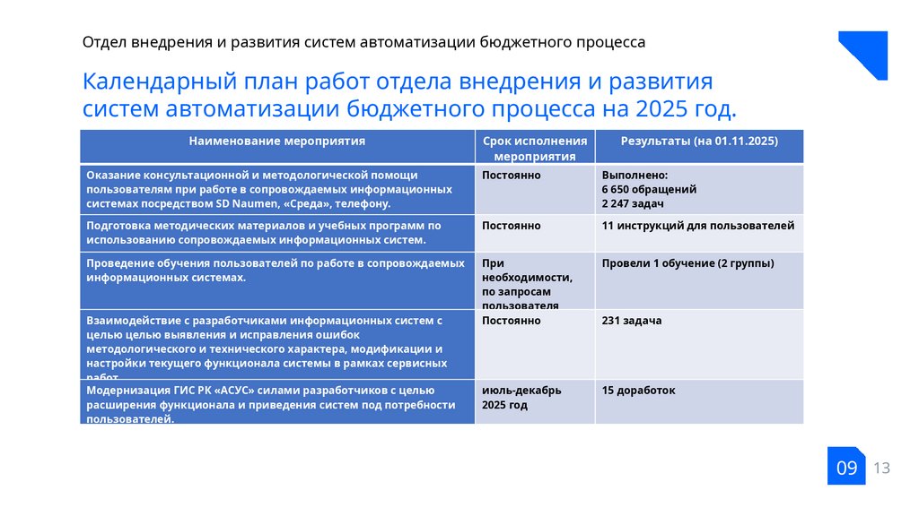 Отдел внедрения и развития систем автоматизации бюджетного процессаКалендарный план работ отдела внедрения и развития