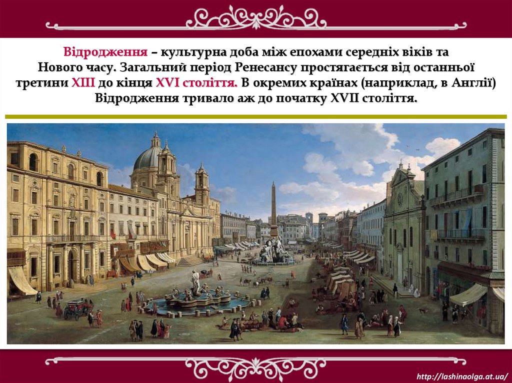 Відродження – культурна доба між епохами середніх віків таНового часу. Загальний період Ренесансу простягається від останньої