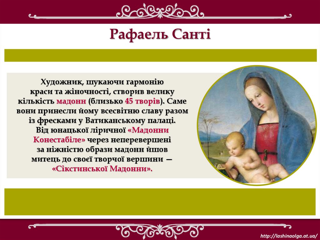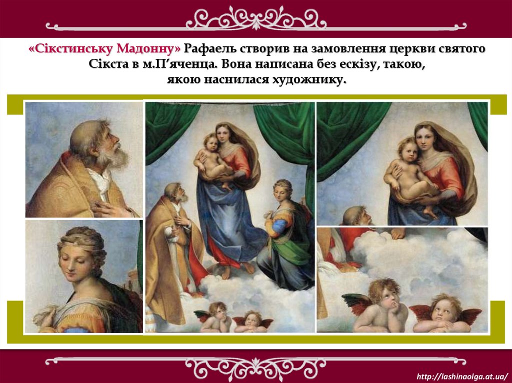 «Сікстинську Мадонну» Рафаель створив на замовлення церкви святогоСікста в м.П’яченца. Вона написана без ескізу, такою,