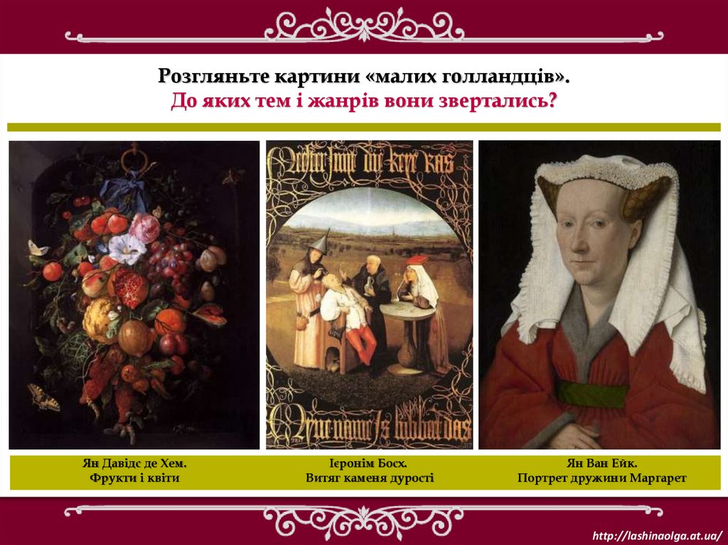 Розгляньте картини «малих голландців».До яких тем і жанрів вони звертались?