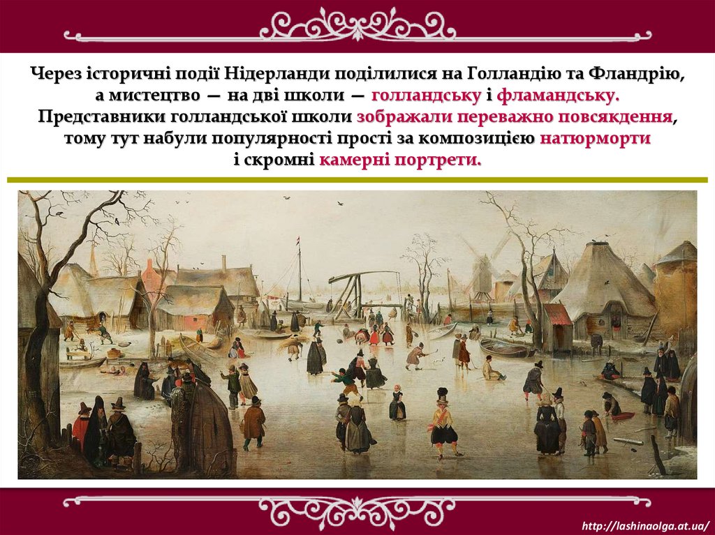 Через історичні події Нідерланди поділилися на Голландію та Фландрію,а мистецтво — на дві школи — голландську і фламандську.