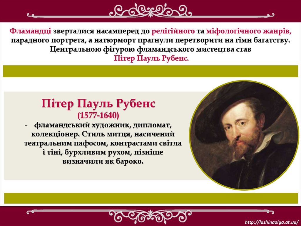 Фламандці зверталися насамперед до релігійного та міфологічного жанрів,парадного портрета, а натюрморт прагнули перетворити на гімн багатству.