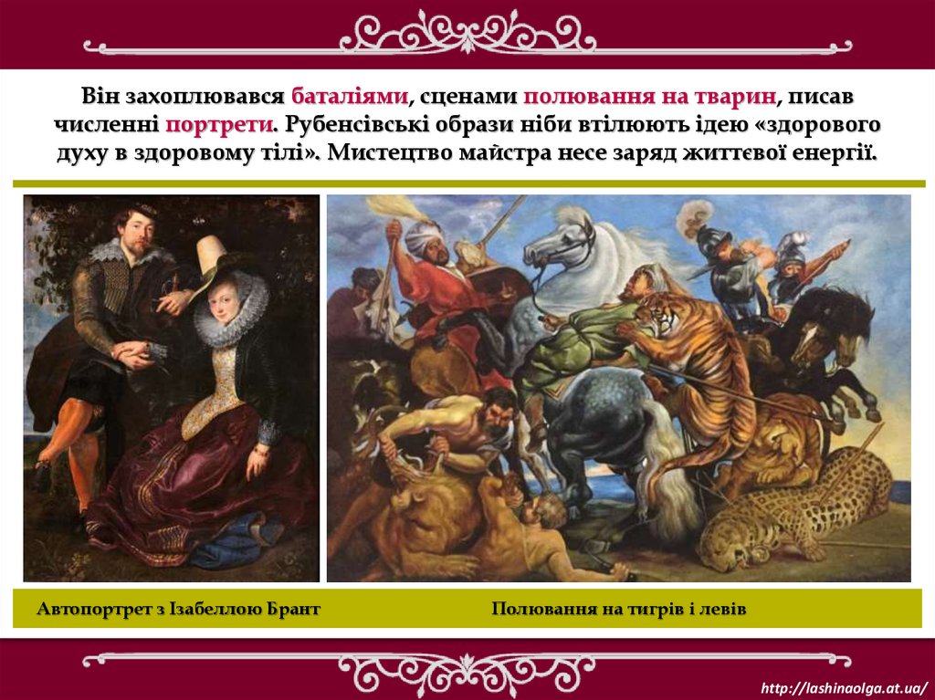Він захоплювався баталіями, сценами полювання на тварин, писавчисленні портрети. Рубенсівські образи ніби втілюють ідею «здорового