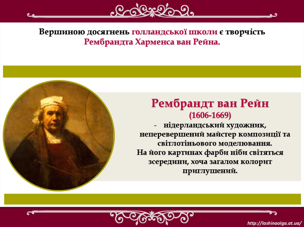 Вершиною досягнень голландської школи є творчістьРембрандта Харменса ван Рейна.