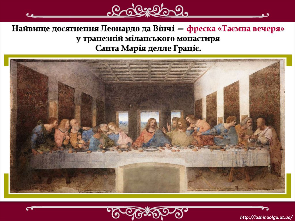 Найвище досягнення Леонардо да Вінчі — фреска «Таємна вечеря»у трапезній міланського монастиря