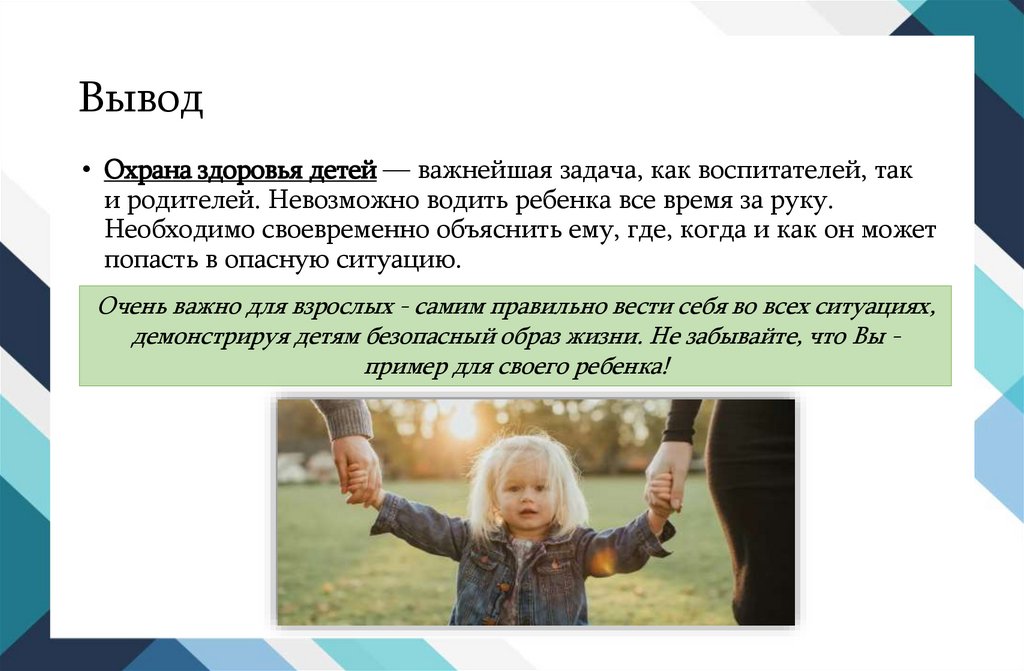 Вывод• Охрана здоровья детей — важнейшая задача, как воспитателей, так