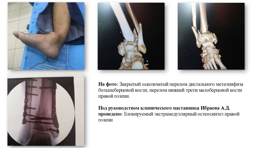 На фото: Закрытый оскольчатый перелом дистального метаэпифизабольшеберцовой кости; перелом нижней трети малоберцовой кости