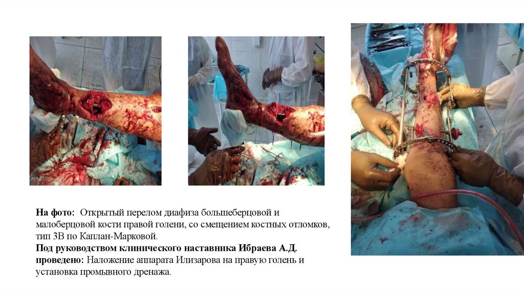 На фото: Открытый перелом диафиза большеберцовой ималоберцовой кости правой голени, со смещением костных отломков,