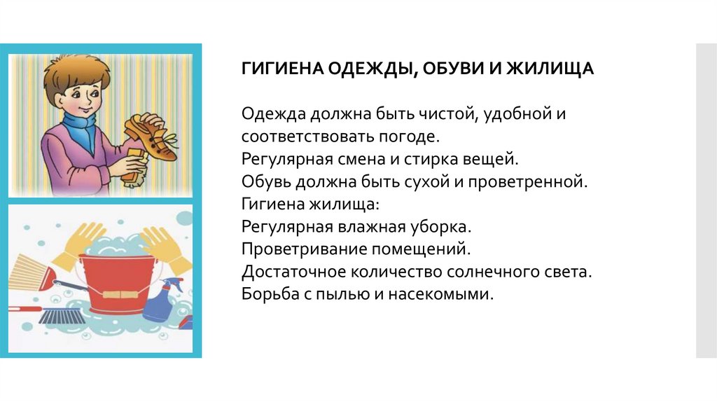 ГИГИЕНА ОДЕЖДЫ, ОБУВИ И ЖИЛИЩАОдежда должна быть чистой, удобной и