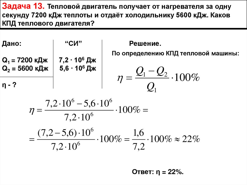 Задача 13. Тепловой двигатель получает от нагревателя за однусекунду 7200 кДж теплоты и отдаёт холодильнику 5600 кДж. Каков
