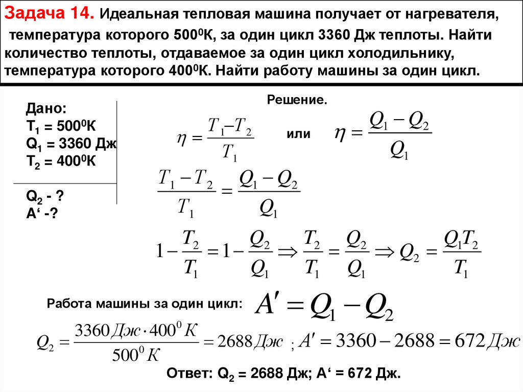 Задача 14. Идеальная тепловая машина получает от нагревателя,температура которого 5000К, за один цикл 3360 Дж теплоты. Найти