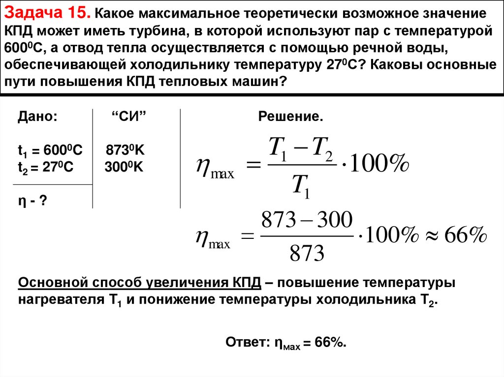 Задача 15. Какое максимальное теоретически возможное значениеКПД может иметь турбина, в которой используют пар с температурой
