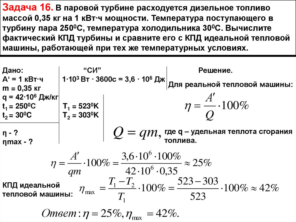 Задача 16. В паровой турбине расходуется дизельное топливомассой 0,35 кг на 1 кВт∙ч мощности. Температура поступающего в