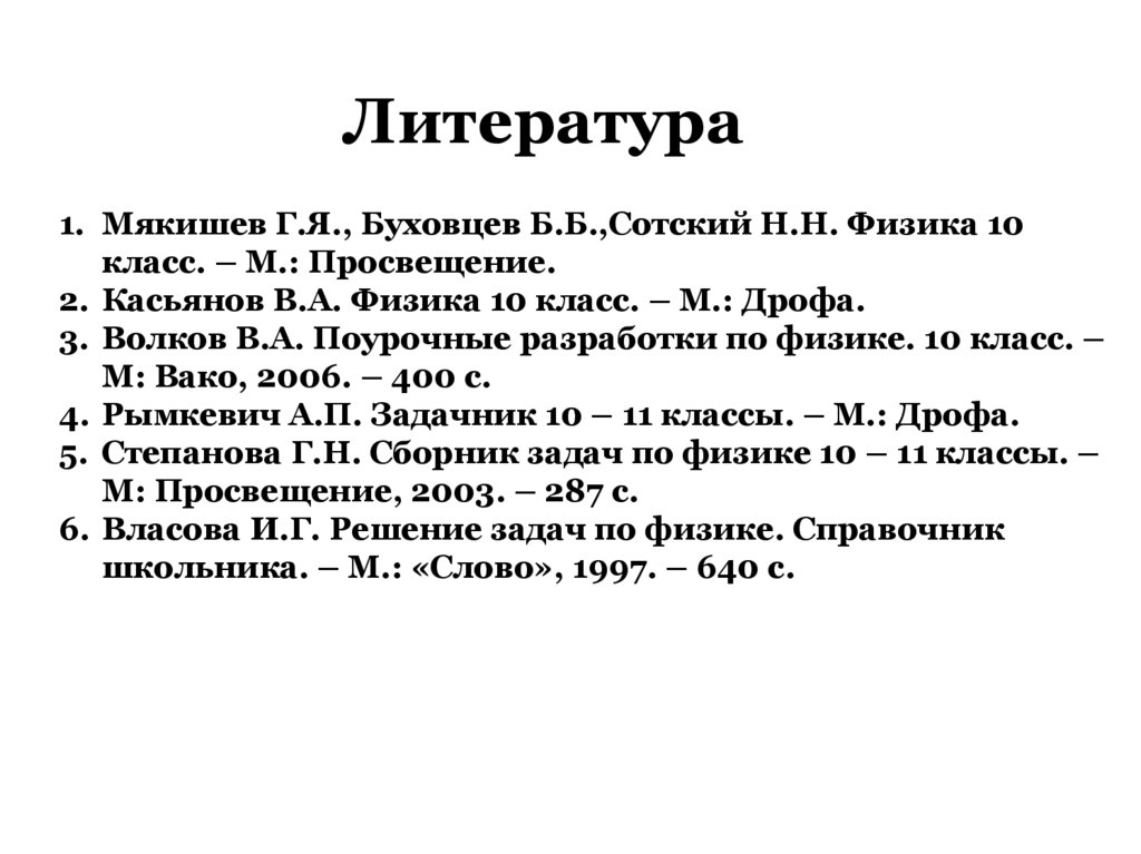 Литература1. Мякишев Г.Я., Буховцев Б.Б.,Сотский Н.Н. Физика 10