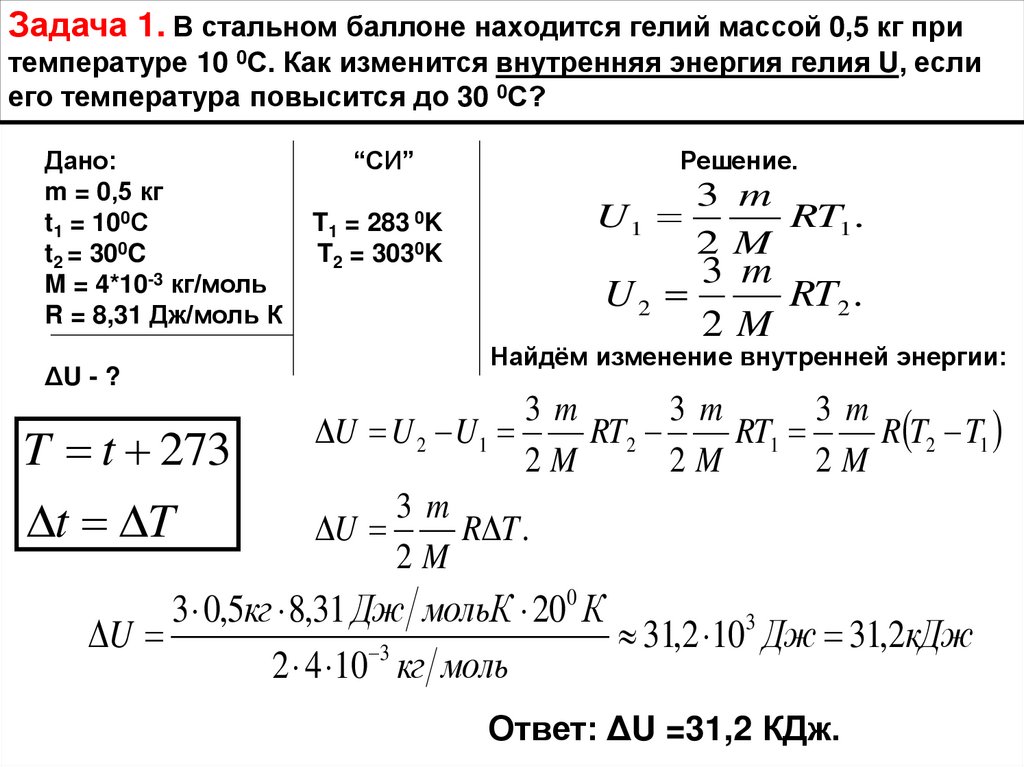 Задача 1. В стальном баллоне находится гелий массой 0,5 кг притемпературе 10 0С. Как изменится внутренняя энергия гелия U, если
