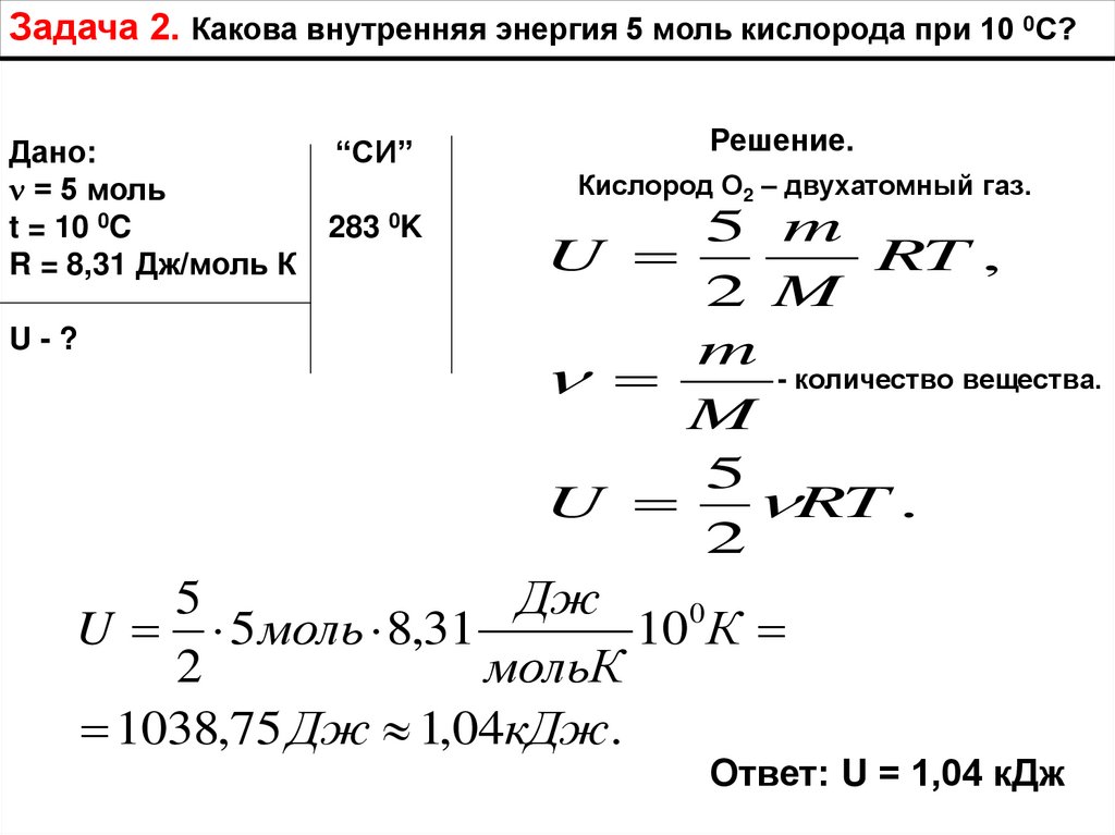 Задача 2. Какова внутренняя энергия 5 моль кислорода при 10 0С?Дано: