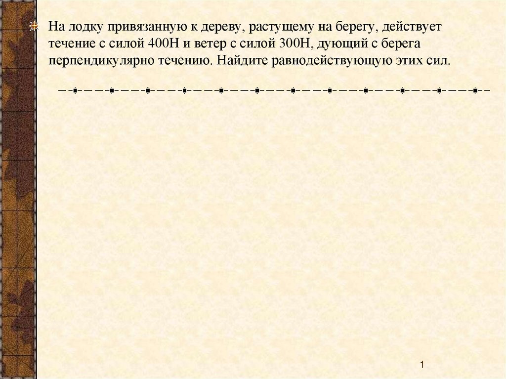 На лодку привязанную к дереву, растущему на берегу, действуеттечение с силой 400Н и ветер с силой 300Н, дующий с берега