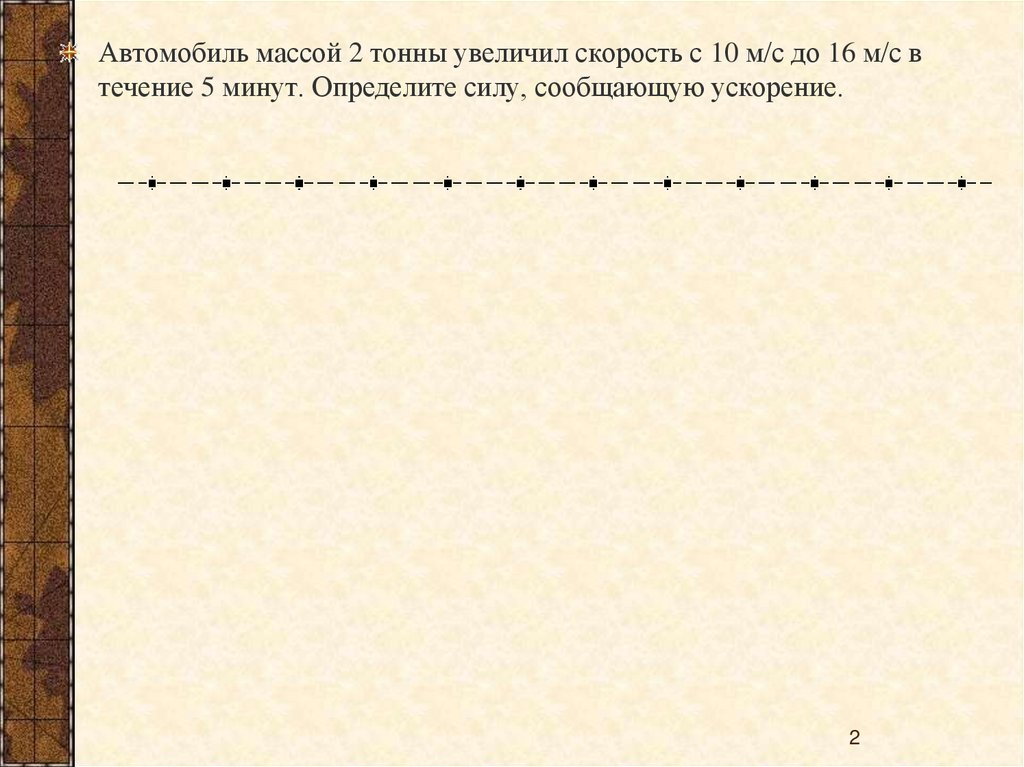 Автомобиль массой 2 тонны увеличил скорость с 10 м/с до 16 м/с втечение 5 минут. Определите силу, сообщающую ускорение.