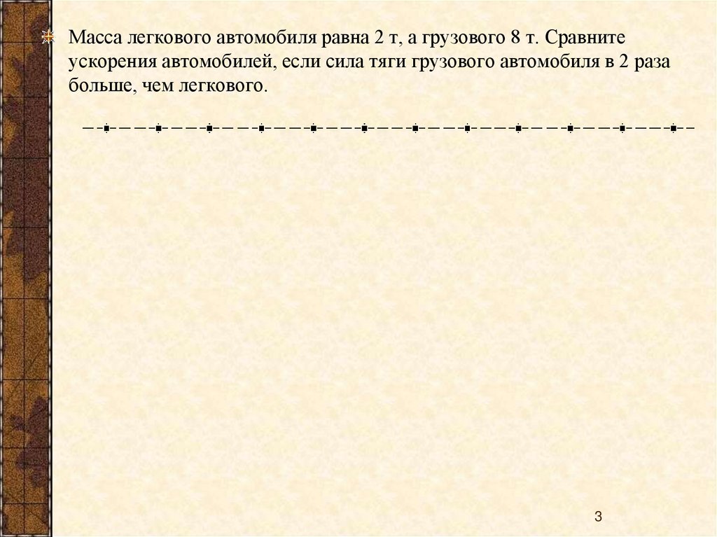 Масса легкового автомобиля равна 2 т, а грузового 8 т. Сравнитеускорения автомобилей, если сила тяги грузового автомобиля в 2 раза