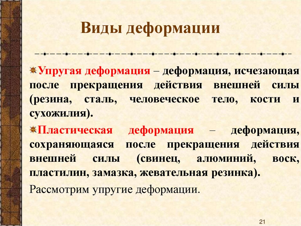 Виды деформацииУпругая деформация – деформация, исчезающая