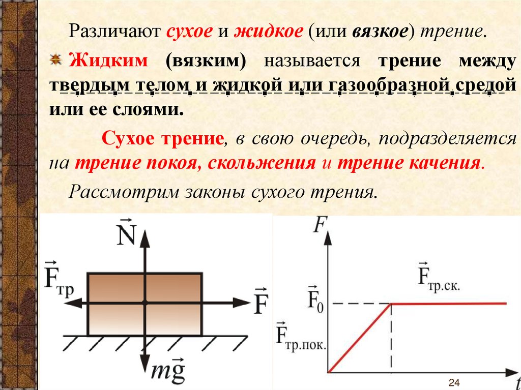 Различают сухое и жидкое (или вязкое) трение.Жидким (вязким) называется трение между