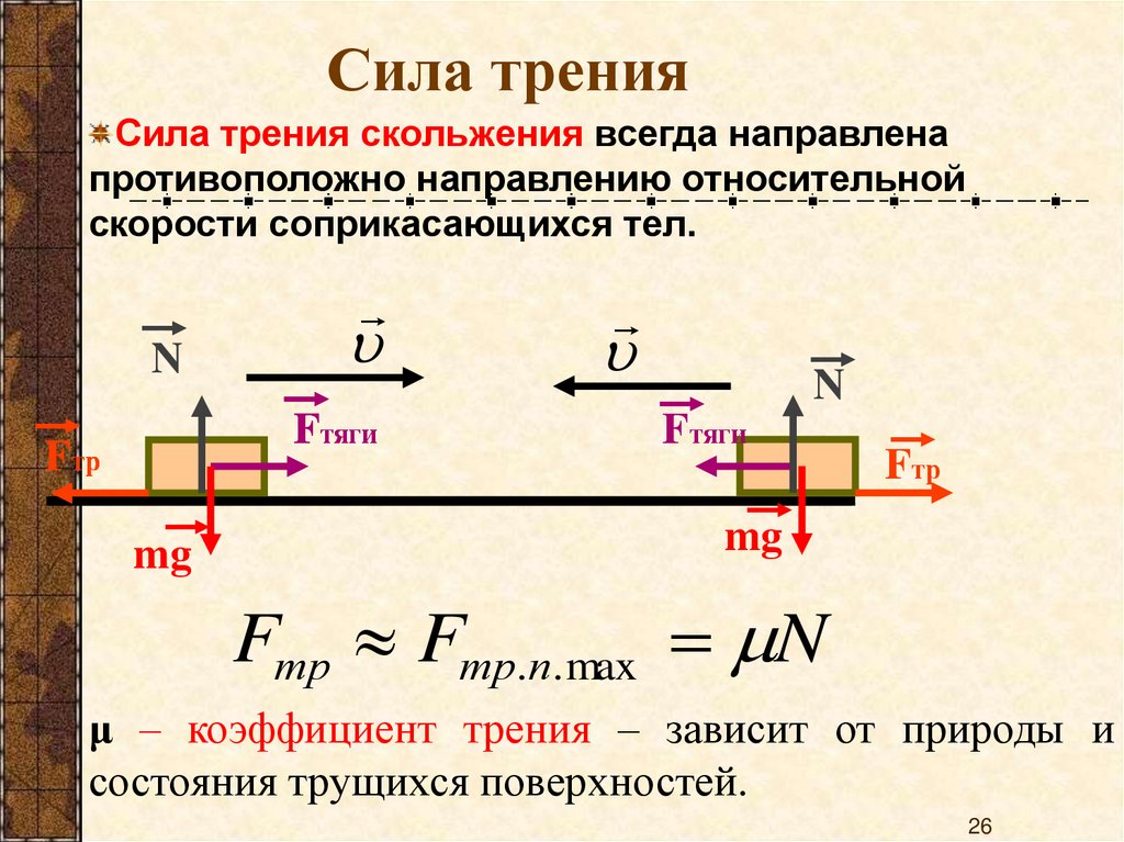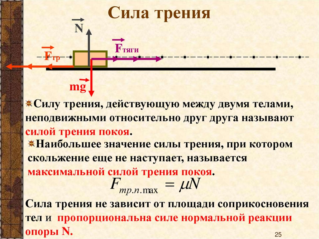 Сила трения - сила, возникающая присоприкосновении поверхностей тел,