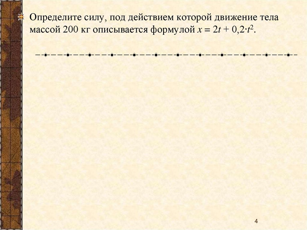 Определите силу, под действием которой движение теламассой 200 кг описывается формулой x = 2t + 0,2∙t2.