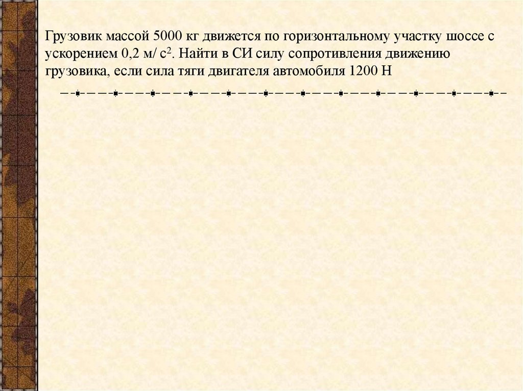 Грузовик массой 5000 кг движется по горизонтальному участку шоссе сускорением 0,2 м/ с2. Найти в СИ силу сопротивления движению
