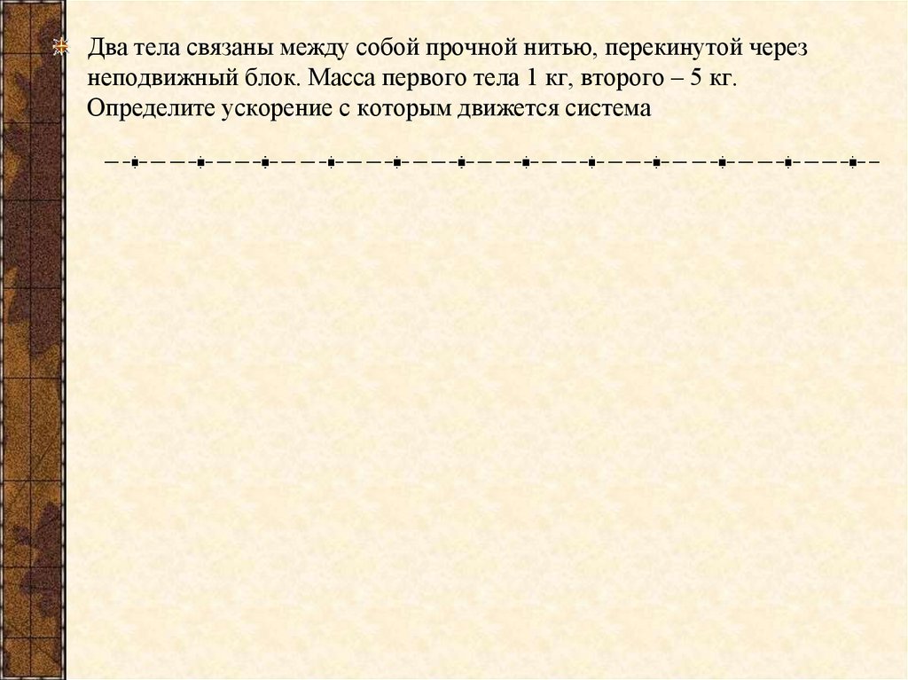 Два тела связаны между собой прочной нитью, перекинутой черезнеподвижный блок. Масса первого тела 1 кг, второго – 5 кг.