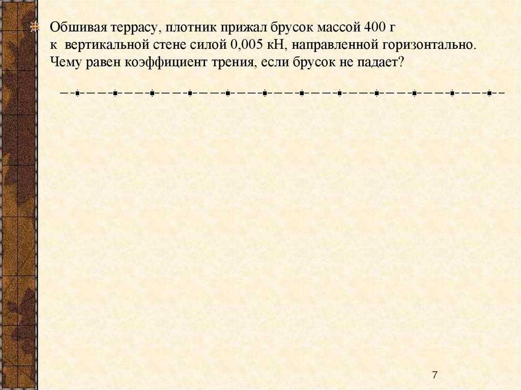 Обшивая террасу, плотник прижал брусок массой 400 гк вертикальной стене силой 0,005 кН, направленной горизонтально.