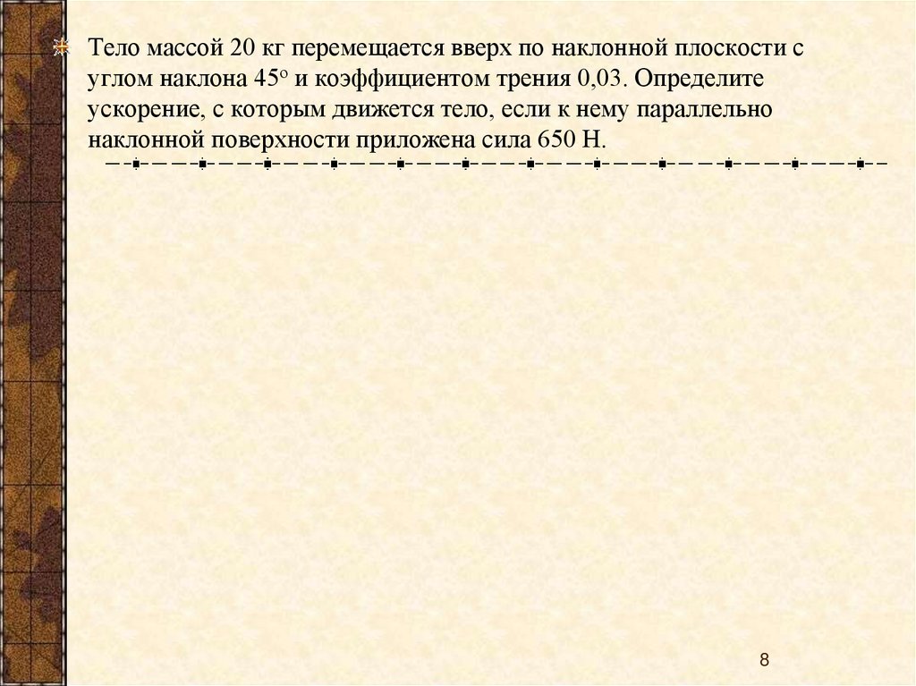 Тело массой 20 кг перемещается вверх по наклонной плоскости суглом наклона 45о и коэффициентом трения 0,03. Определите