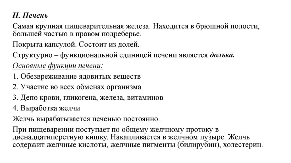 II. ПеченьСамая крупная пищеварительная железа. Находится в брюшной полости,