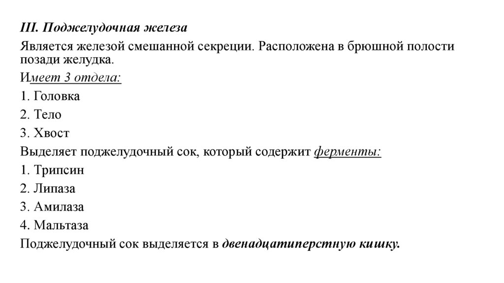 III. Поджелудочная железаЯвляется железой смешанной секреции. Расположена в брюшной полости