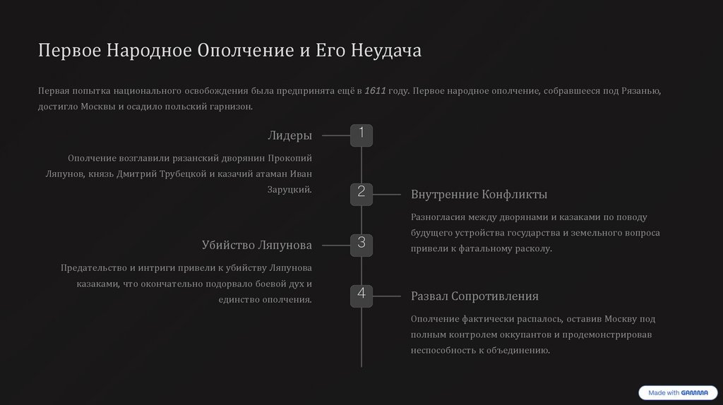 Первое Народное Ополчение и Его НеудачаПервая попытка национального освобождения была предпринята ещё в 1611 году. Первое народное ополчение, собравшееся под Рязанью,